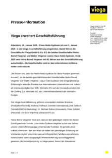 Der Viega-Geschäftsleitung gehören unverändert Andreas Brockow (Produktion/Technik), Andreas Fiefhaus (Vertrieb International), Dirk Gellisch (Vertrieb DACHL/Marketing), Dr. Michael Rehse (Innovation), Peter Schöler (Personal) und Axel Wachholz (Finanzen/IT) an.